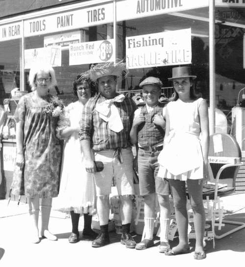 Dorothy Kotter, Bessie, Donald, Monte & Linda in front of our Gambles Store